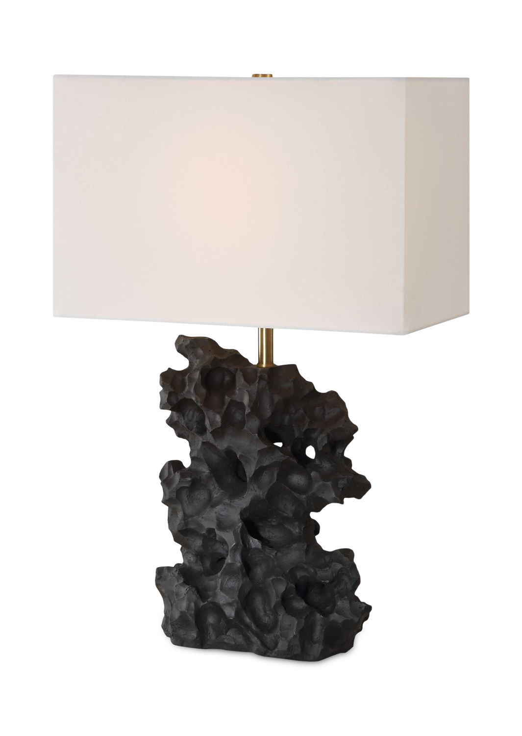 - Crafted From A Black Man-made Stone, This Unique Table Lamp Replicates A Rock Sculpture That Boasts Heavy Texture With Distinctive Holes, Displayed Atop A Thick Crystal Base With Plated Antique Brass Hardware.