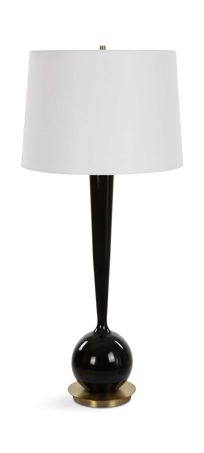 Illuminate your space with a touch of vintage charm and modern elegance with the Brielle Polished Black Table Lamp from Uttermost. This table lamp pays homage to 1960's Mod design, featuring a sleek ceramic silhouette in a polished black glaze, beautifully complemented by plated brushed brass details for a touch of sophistication. The slightly tapered round hardback shade in crisp white linen fabric adds a contemporary touch to the overall aesthetic. Perfect for adding ambiance to your living room, bedroom, or office, this black table lamp exudes style and versatility.