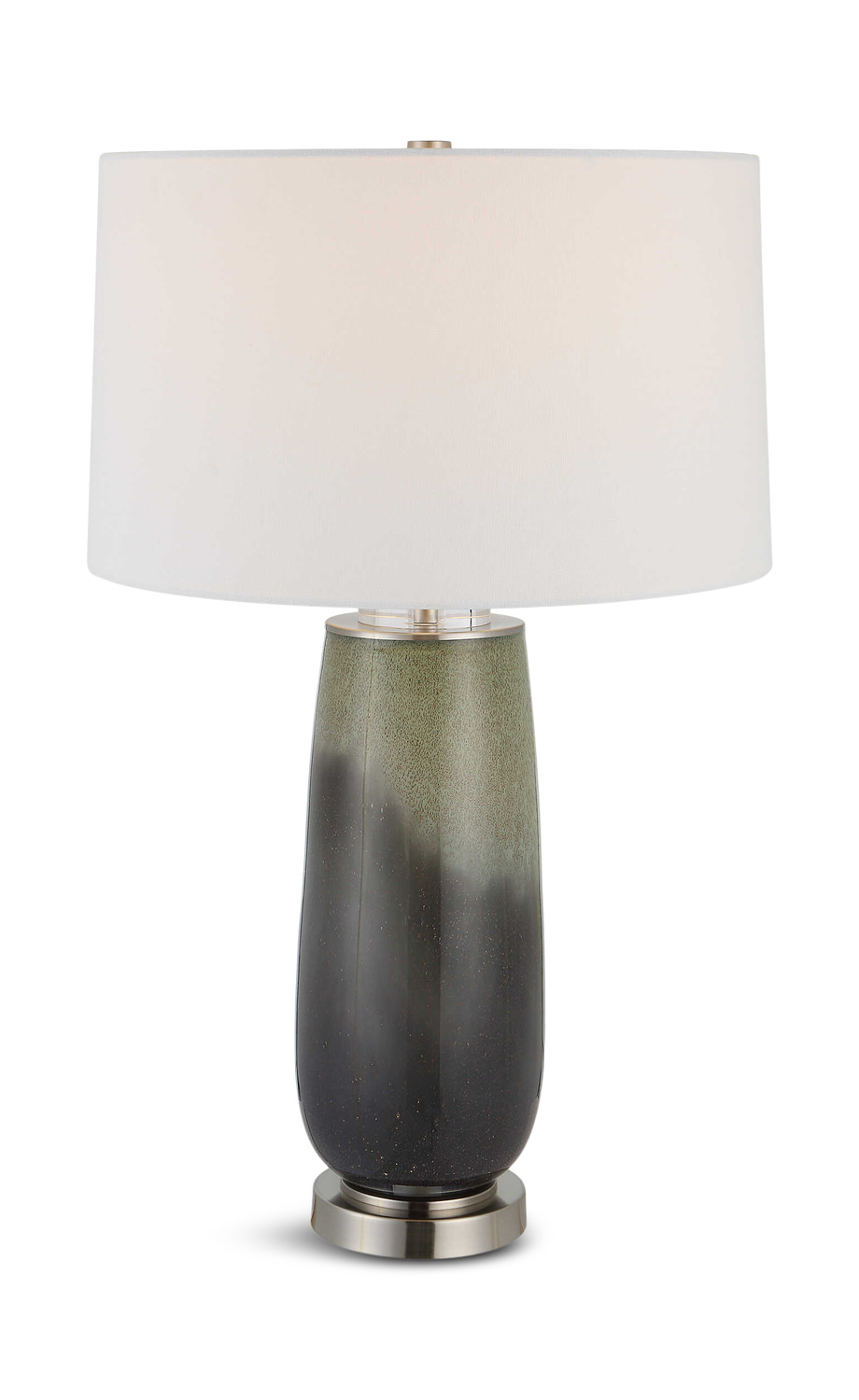 - This Elegant Table Lamp Features A Beautiful Speckled Green And Gray-blue Ombre Glass Base With Crystal Accents And Brushed Nickel Finished Iron Details.