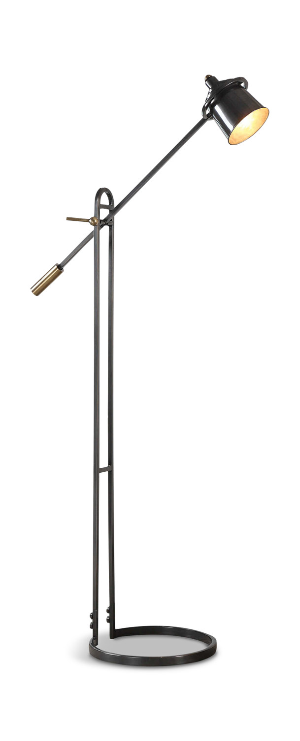 - This Steel Lamp Features A Delicate Stature With A Wide Footprint, Finished In A Plated, Dark Oil Rubbed Bronze, Accented With Antique Brass Details. The Shade Arm Is Adjustable In Height And Shade Pivots Left And Right.