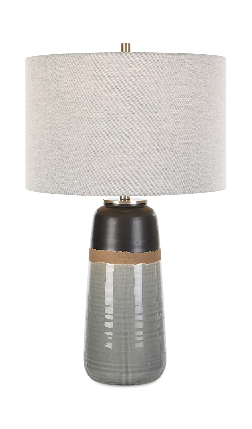 - This Ceramic Table Lamp Features A Warm Gray And Aged Black Glaze Finish Separated By A Rustic Brown Uneven Band, Accented With Brushed Nickel Details.