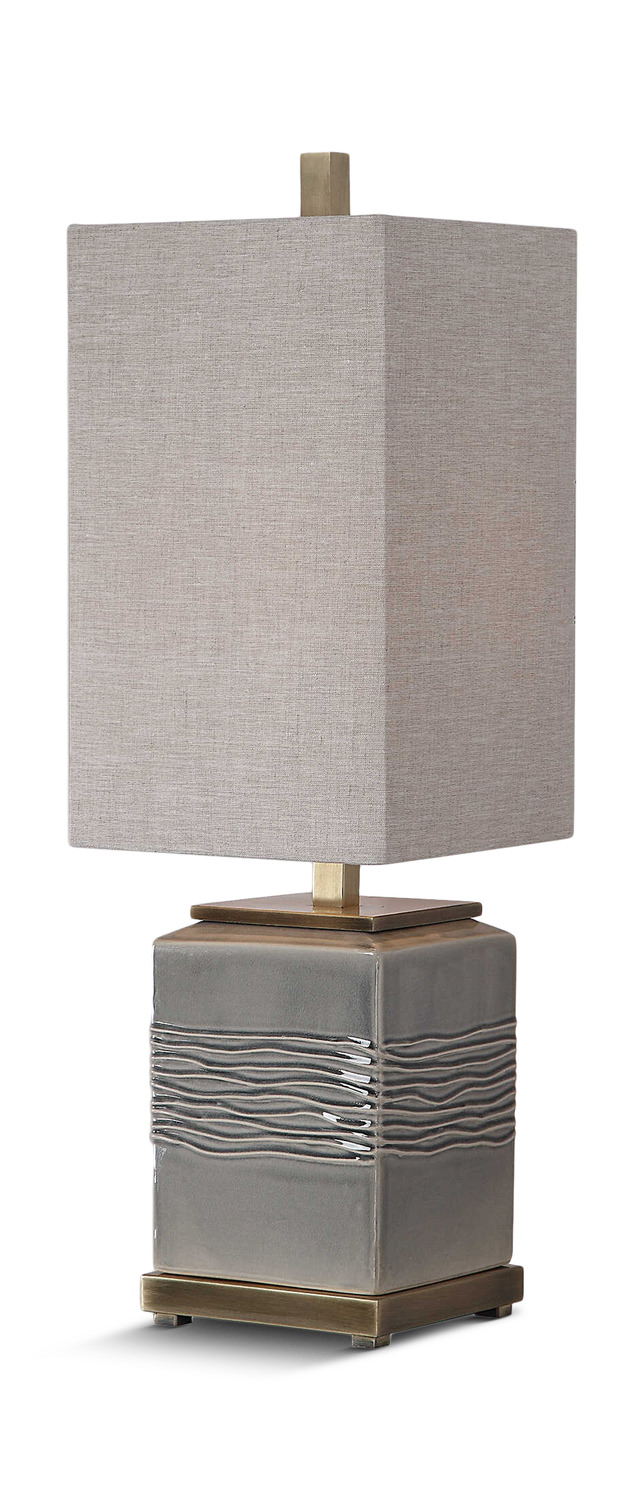 Elevate your living space with the mesmerizing charm of the Uttermost Covey Gray Glaze Table Lamp from HOM Furniture. This exquisite lamp exudes a contemporary allure with its ceramic base adorned with wavy embossing, lending it a subtle organic touch. The warm gray glaze seamlessly complements the plated antique brass details, adding a touch of sophistication to your decor. Topped with a rectangular hardback shade in light beige linen featuring natural slubbing, this lamp radiates a soft, inviting glow that enhances any room.