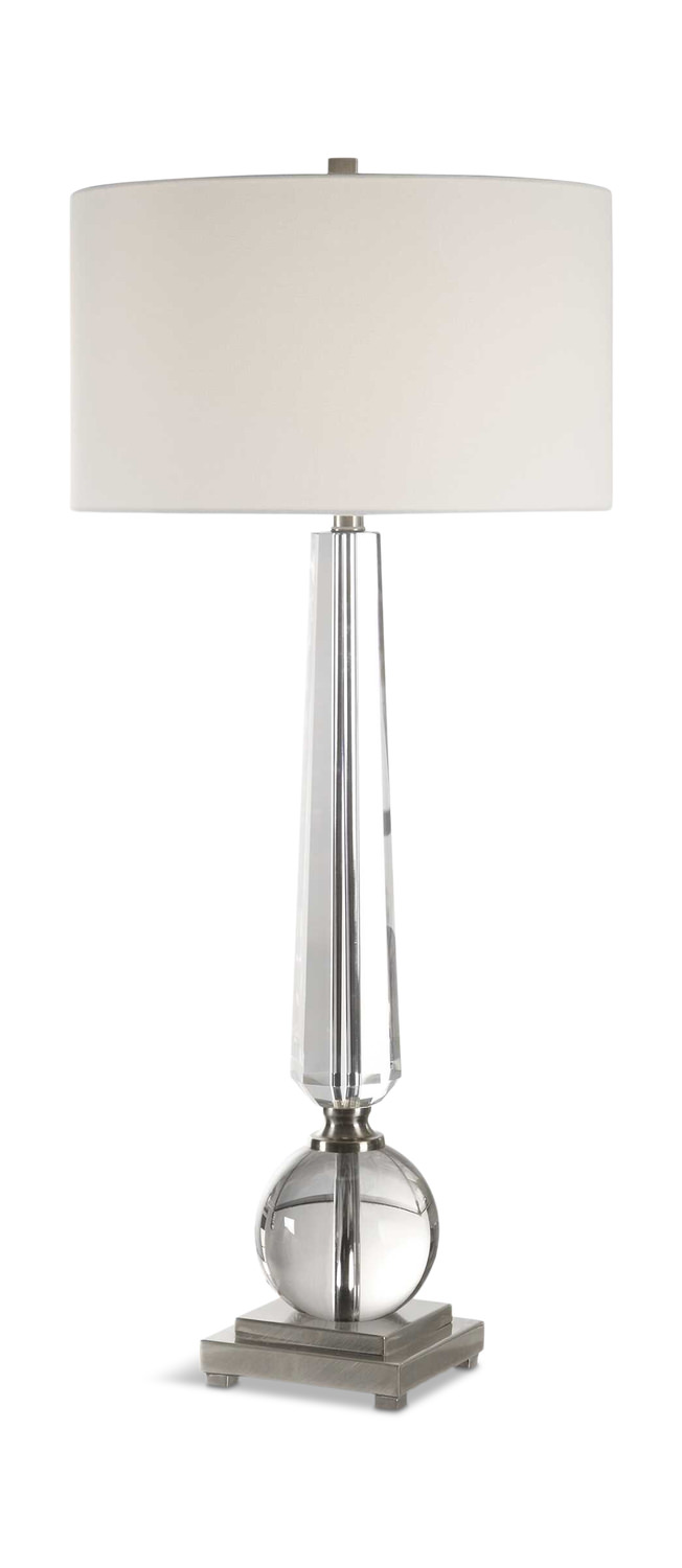 - This Elegant Lamp Features A Tapered Cut Crystal Column, Displayed With A Thick Crystal Sphere, Creating A Timeless Design That's Paired With Brushed, Antiqued Nickel Plated Details For An Updated Appeal.