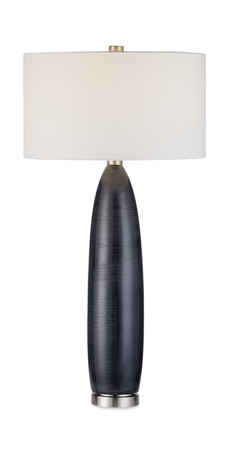 - This Handcrafted Ceramic Table Lamp Showcases An Elevated Look With A Striped Motif And A Prussian Blue-gray Glaze. Brushed Nickel Plated Iron Details Accentuate The Design.