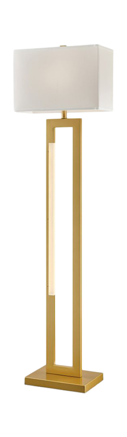 Introducing the Darrello Floor Lamp by HOM Furniture. This elegant lamp is finished in a soft gold hue and constructed of durable metal for a lasting quality. The lamp shade is beautifully finished in a white fabric, adding a touch of sophistication to any space. With LED night light capability and a convenient three-way switch, this floor lamp is both functional and stylish. Illuminate your home with the Darrello Floor Lamp from HOM Furniture.