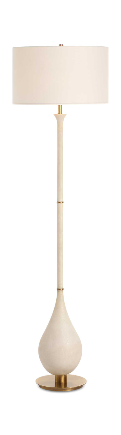 Elevate the ambiance of your space with the Dewdrop Ivory Floor Lamp from Uttermost. Crafted with a teardrop-shaped base made of ivory man-made stone that beautifully mimics the appearance of Thassos marble, this lamp exudes sophistication. The base is adorned with plated brushed antique brass details for a touch of elegance. Topped with a round hardback shade in crisp white linen fabric, the Dewdrop Floor Lamp casts a warm and inviting glow. Whether placed in a living room, bedroom, or office, this floor lamp is sure to make a refined statement in any setting.