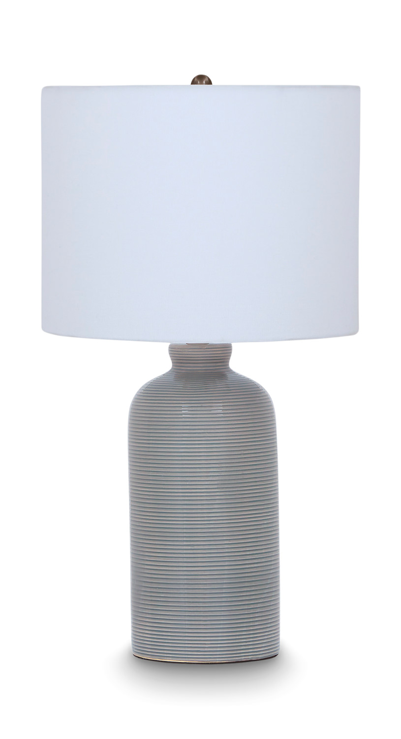 Illuminate your space with the Flint Table Lamp from HOM Furniture. Crafted from ceramic with a textured pattern and finished in a stylish gray-blue glaze, this lamp exudes sophistication and charm. The design is sleek and modern, featuring clean lines and a white linen drum shade that complements the lamp's casual style. With its versatile grey color and ceramic material, this table lamp is the perfect addition to any room in need of a touch of elegance and simplicity. Add a warm and inviting glow to your home with the Flint Table Lamp.