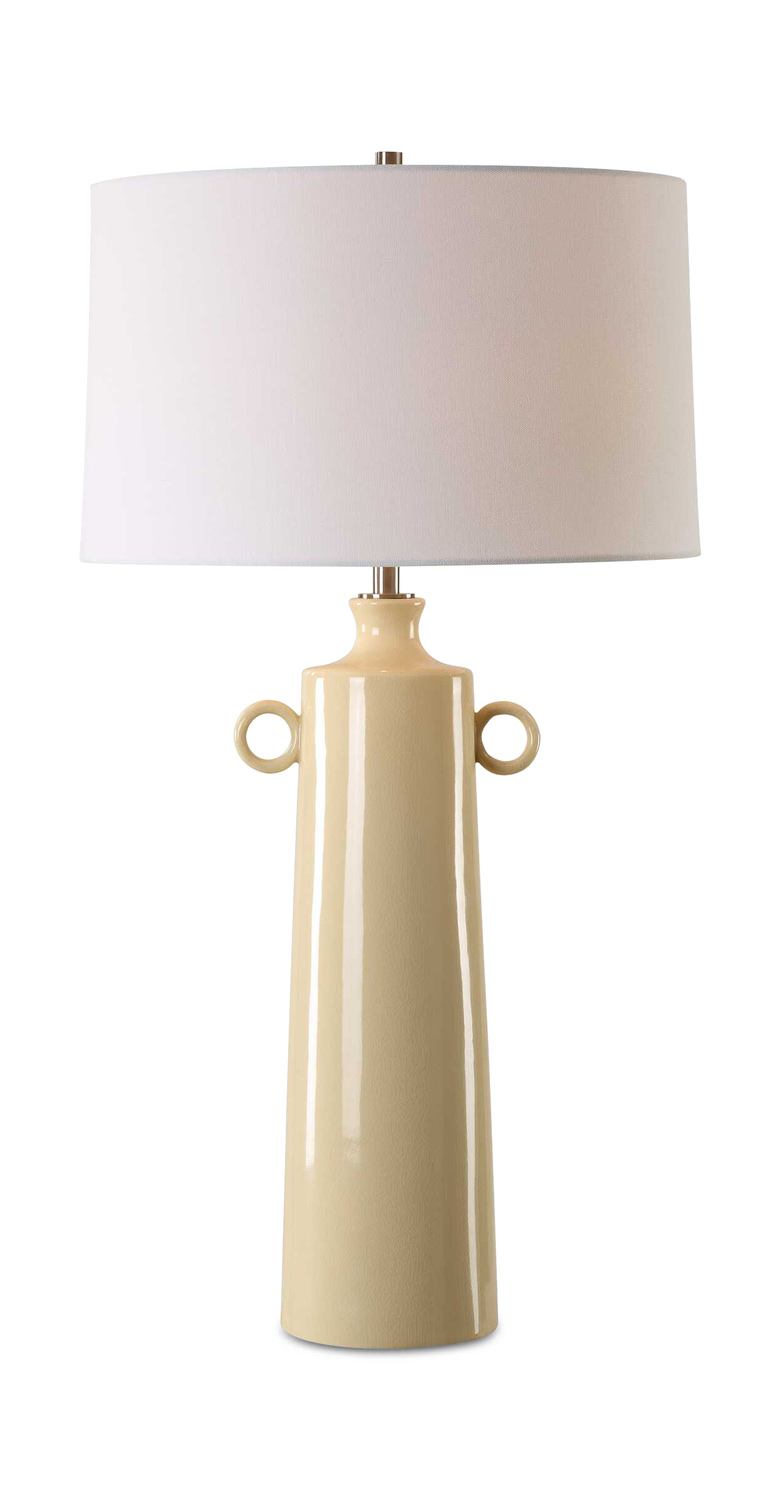 Bring the warm glow of sunshine into your living space with the Florero Pale Yellow Table Lamp from HOM Furniture. This stunning ceramic lamp features a vase-like shaped base in a charming pale yellow crackled glaze, beautifully complemented by plated brushed nickel details for a touch of elegance. The lamp is topped with a slightly tapered round drum shade in a crisp white linen fabric, adding a clean and modern look to the piece. With its soothing yellow color and sophisticated design, this table lamp from Uttermost is sure to brighten up any room in your home with style and grace.