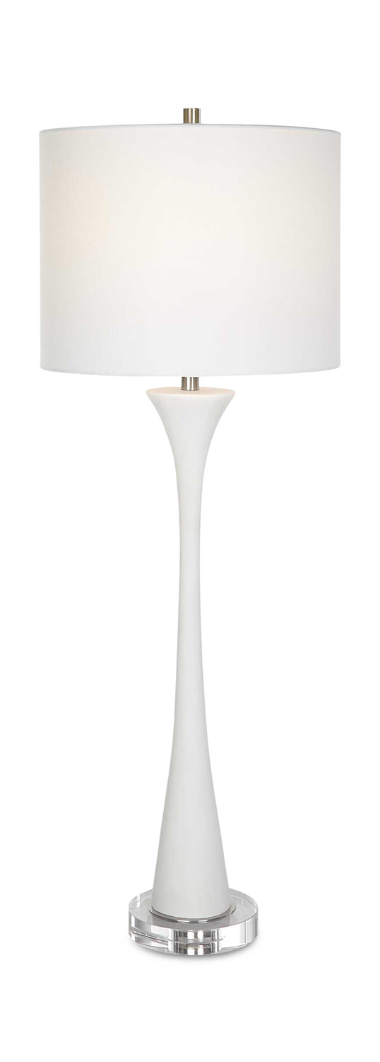 Elevate your home decor with the exquisite Fountain White Marble Buffet Lamp from HOM Furniture. This stunning lamp features a classic trumpet shape handcrafted from ivory man-made stone that beautifully replicates the luxurious look of Thassos marble. The lamp is elegantly displayed on a thick crystal foot and accented with brushed nickel plated details, exuding sophistication and style. Topped with a white fabric shade, this Uttermost brand table lamp in white/off white color will add a touch of timeless elegance to any room. Illuminate your space with grace and beauty with the Fountain White Marble Buffet Lamp.