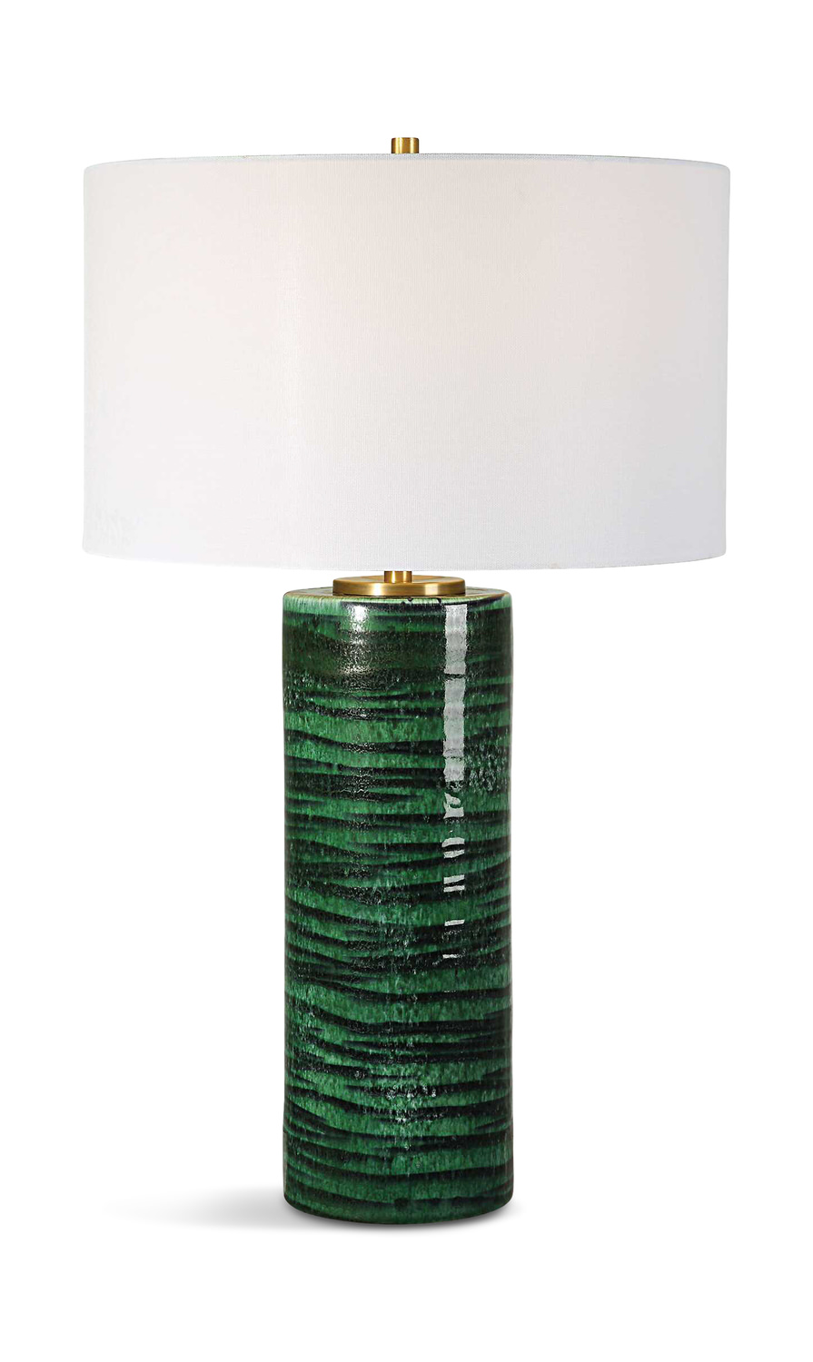 - This Table Lamp Features A Ceramic Base Finished In A Two-toned Dark And Light Emerald Green Glaze With An Abstract Stripe Pattern, Accented With Antique Brass Plated Details.