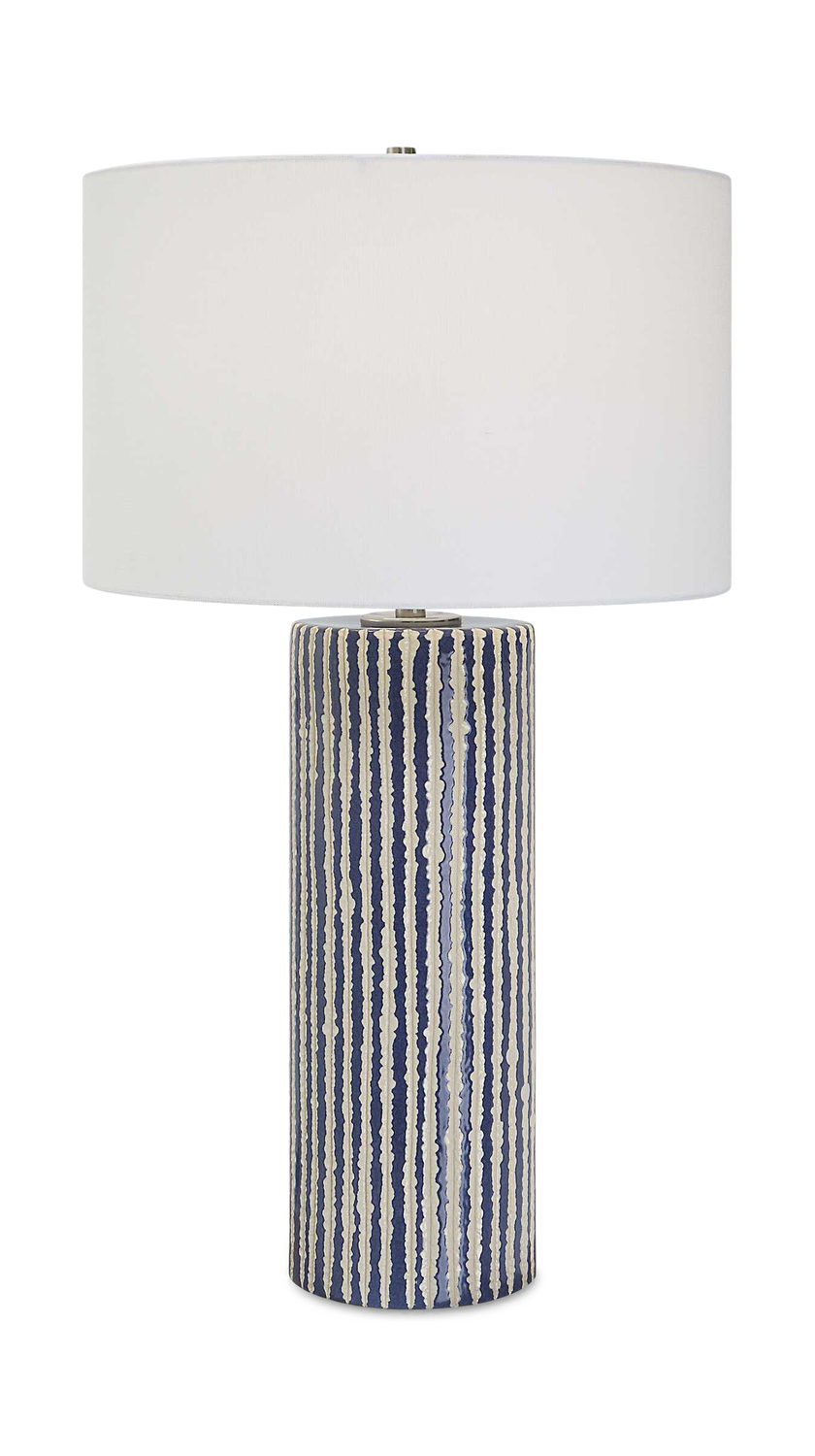 - This Ceramic Table Lamp Features Eye-catching, Crudely Carved, Cobalt Glazed Stripes With Contrasting Ivory, Accented With Brushed Nickel Details.