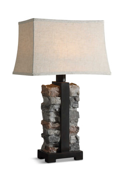 - This Indoor/outdoor Lamp Features A Three Dimensional Stacked Stone Design Formed Out Of Molded Concrete, Paired With Rustic Black Metal Details.