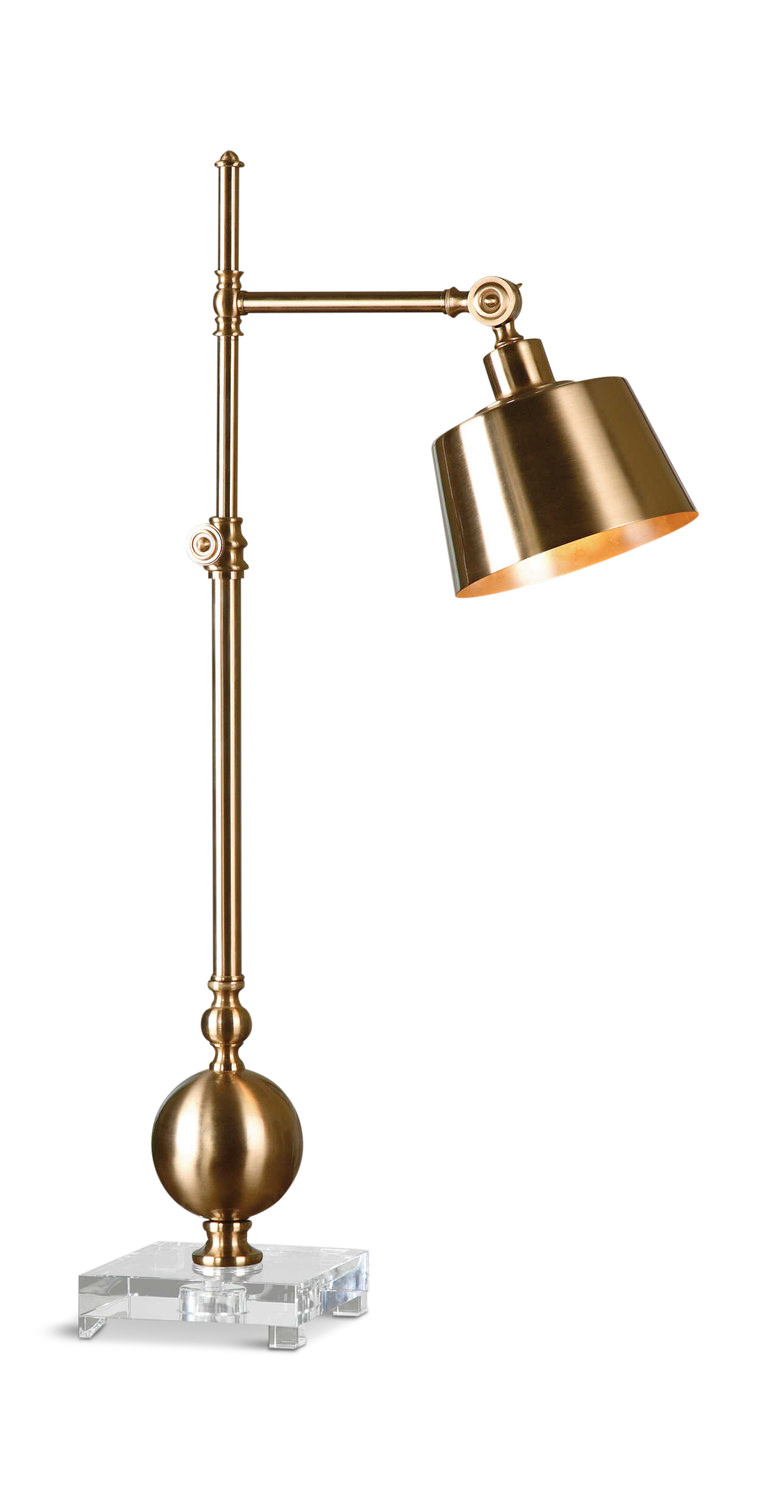 - Brushed Brass Plated Metal Accented With A Thick Crystal Foot. The Shade Pivots Up And Down And Lamp Is Adjustable In Height.