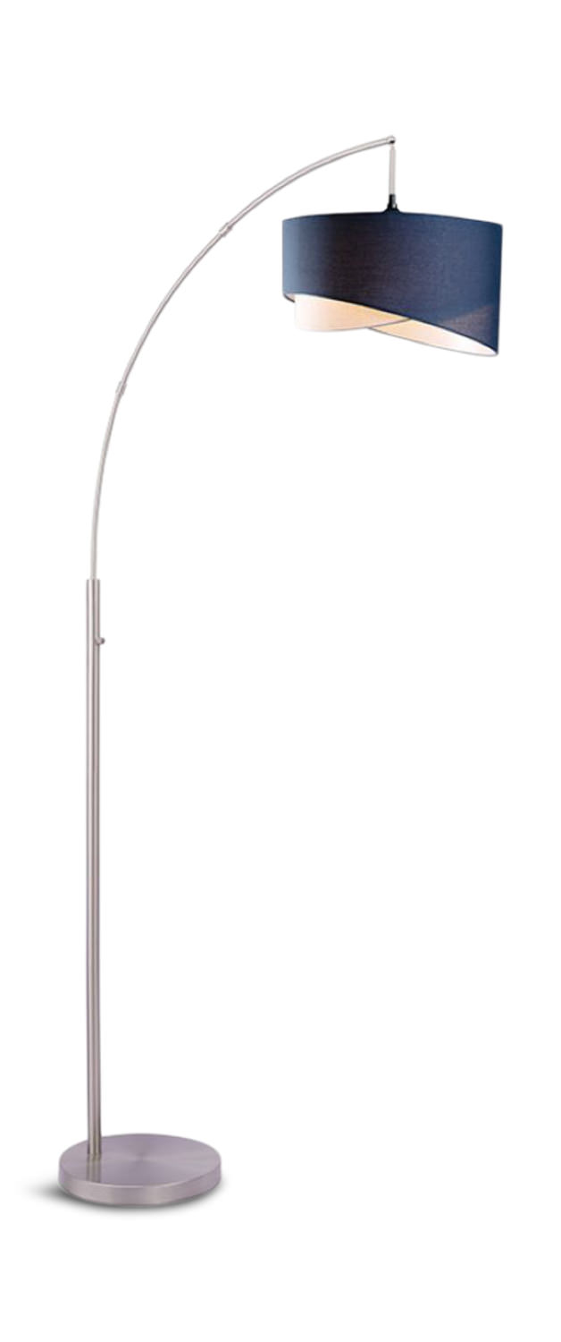 Introducing the Leonara Arc Lamp from HOM Furniture, a stunning addition to your living space. This unique lamp is finished in a brushed nickel and constructed of durable metal, ensuring both style and longevity. The navy and grey lampshade accent adds a pop of color, while the detailed two-layered shade creates a dynamic visual effect. Elevate your home décor with the modern and sophisticated Leonara Arc Lamp.