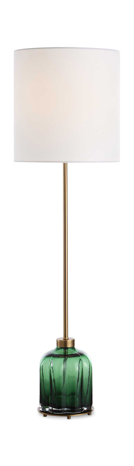 - Timeless In Design, The Lois Buffet Lamp Showcases A Fluted Emerald Glass Base That's Paired With Antique Brass Plated Accents.
