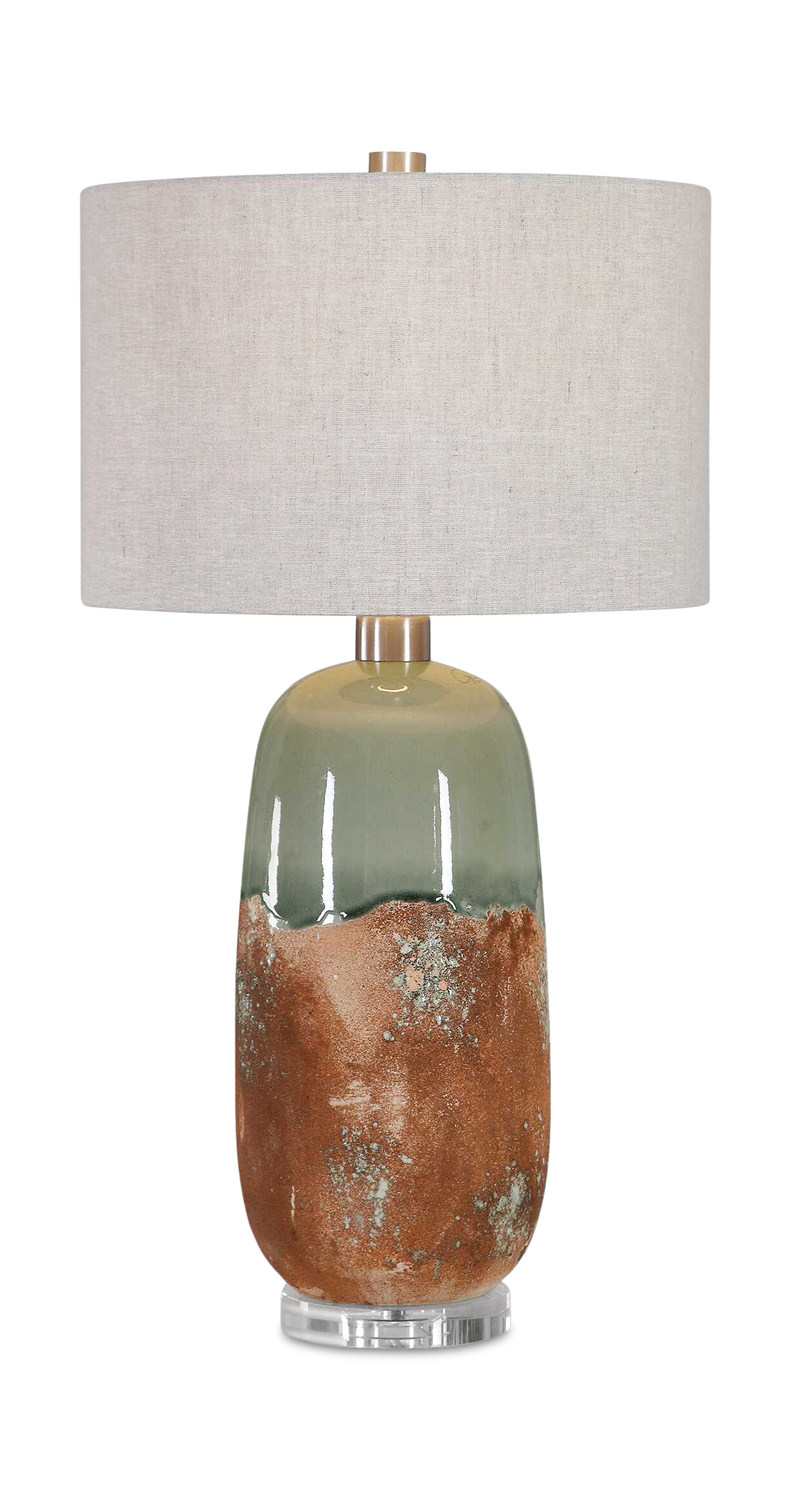 - This Table Lamp Features A Ceramic Base Finished In An Earthy Terracotta Rust That Transitions Into A Crackled Green-gray Glaze, Accented With Brushed Nickel Plated Details And A Thick Crystal Foot.
