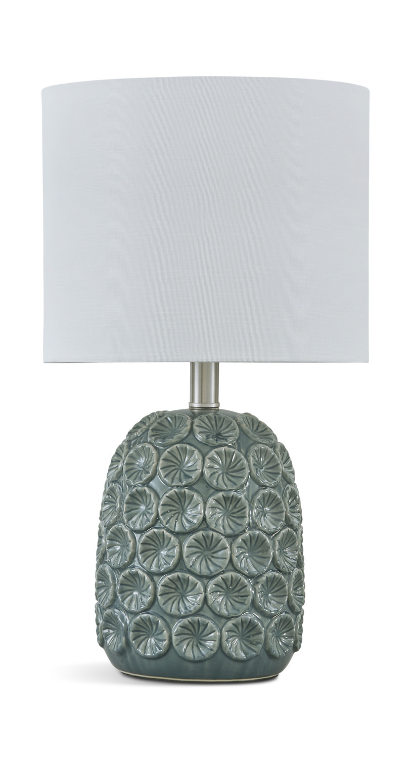 Masie Table Lamp has a patterned ceramic base in a glazed teal finish. A floral-like motif repeatedly in rows, gives this piece an eye-catching appeal. Both raised and recessed, the motif contributes to the overall dimensional appearance. The white fabric shade gives Masie the perfect finish with balance.