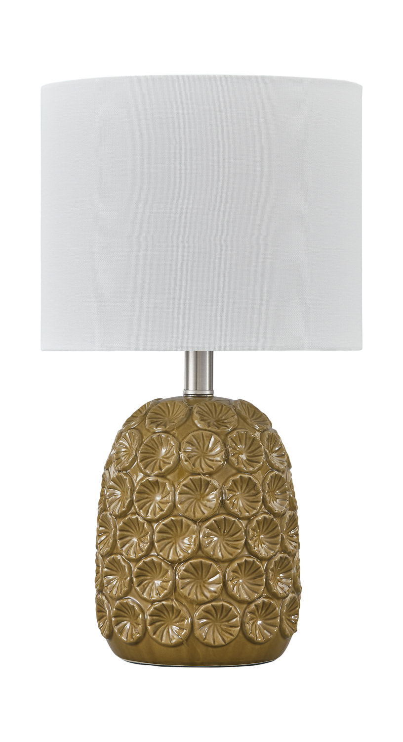 Mary Table Lamp has a patterned ceramic base in a glazed gold finish. A floral-like motif repeatedly in rows, gives this piece an eye-catching appeal. Both raised and recessed, the motif contributes to the overall dimensional appearance. The white fabric shade gives Masie the perfect finish with balance.