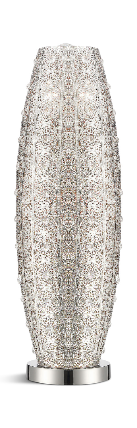 The intricate, lace-like textured metal sconce of the Masura Table Lamp stands on polished steel, round foot. Light passes through the exterior pattern and provides light, illuminating the decorative body of this beautiful lamp. Place it on a buffet in pairs, or use it on a sofa table either singly or paired and allow the beauty to fill the space.