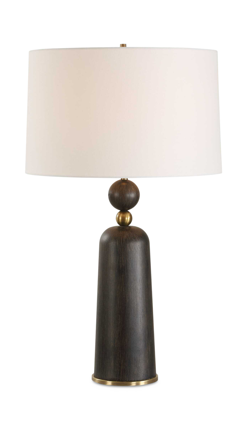 - The McQuinn Table Lamp Features A Wooden Cylindrical Base In A Dark Walnut Finish With An Antique Brass Plated Sphere Decoration For Added Elegant Appeal.