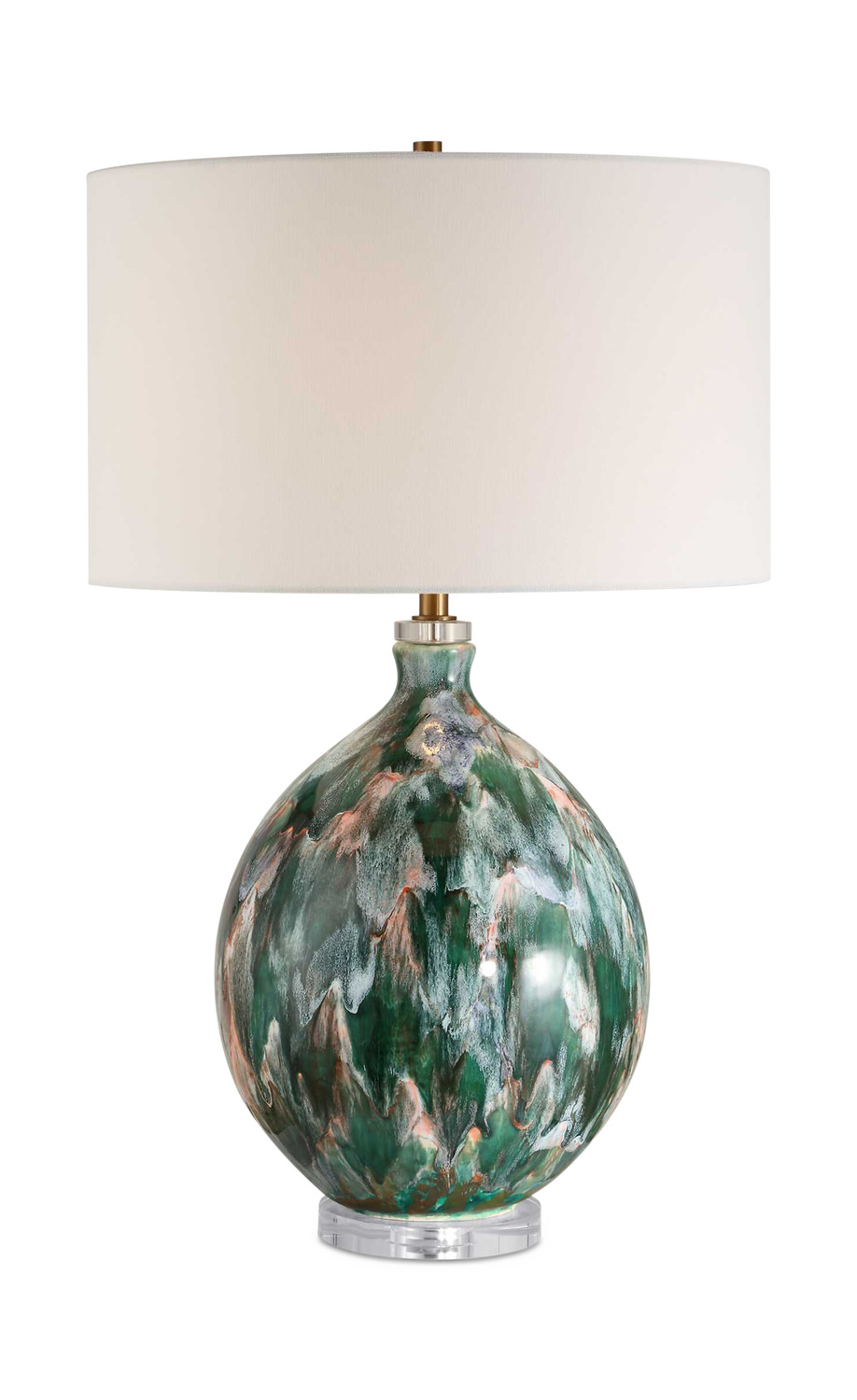 - The Mihaela Table Lamp Resembles An Abstract Work Of Art. The Ceramic Base Is Adorned With An Ivory, Dark Green, And Subtle Salmon-toned Drip Glaze, Creating A Captivating Interplay Of Colors, Enhanced By Crystal Details And Brass Plated Accents.