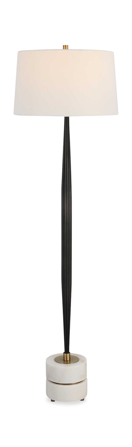 Elevate your home décor with the Miraz Iron Floor Lamp from HOM Furniture. Crafted with a channeled cast iron base, brushed brass accents, and a substantial white marble foot, this lamp exudes sophistication and style. The tapered hardback shade, enveloped in a sleek white cotton fabric, adds a touch of elegance to any room. From the renowned Uttermost brand, this black floor lamp is the perfect statement piece to illuminate your space with a blend of modern and classic design elements. Brighten up your living space with the Miraz Iron Floor Lamp today.