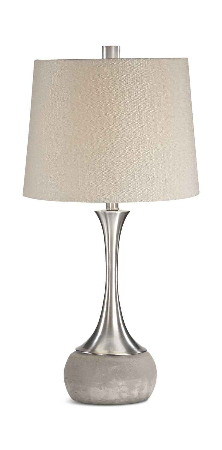 • This Sleek Spun Metal Base Features A Plated Brushed Nickel Finish, Displayed On A Smoothed Natural Concrete Foot.