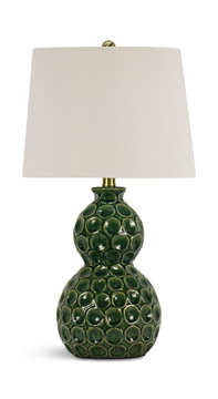 Introducing the Nico Table Lamp from HOM Furniture. This elegant lamp is expertly crafted from ceramic and features a unique gourd shape in a charming green finish. The tapered light tan linen shade complements the lamp beautifully. The standout feature of this lamp is the statement pattern of round dimples across the entire body, creating a visually appealing design. Finished with brushed brass metal accents, the Nico Table Lamp adds a touch of sophistication to any space.