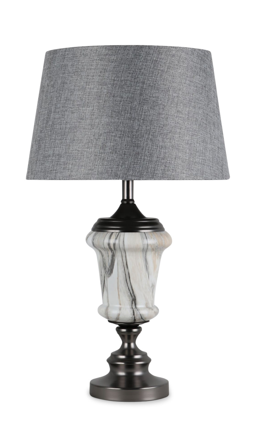 Looking to update your style without overspending, than the Norah Table Lamp will be your perfect lamp. This lamp has an updated traditional style with it's turned marble looking base, dark silver metallic accents and slightly tapered grey textured drum shade. The lamp would look perfect in a formal dining room as a pair on a buffet table. It will bring in the fresh grey coloration into your space, but won't compete with your existing traditional furniture, or add a pair of these lamps to a modern bedroom to add an eclectic accent with ties to the past. Anywhere you add the Norah Table Lamp you will be bringing your space into the new generation, but will be taking it's design cues from history.