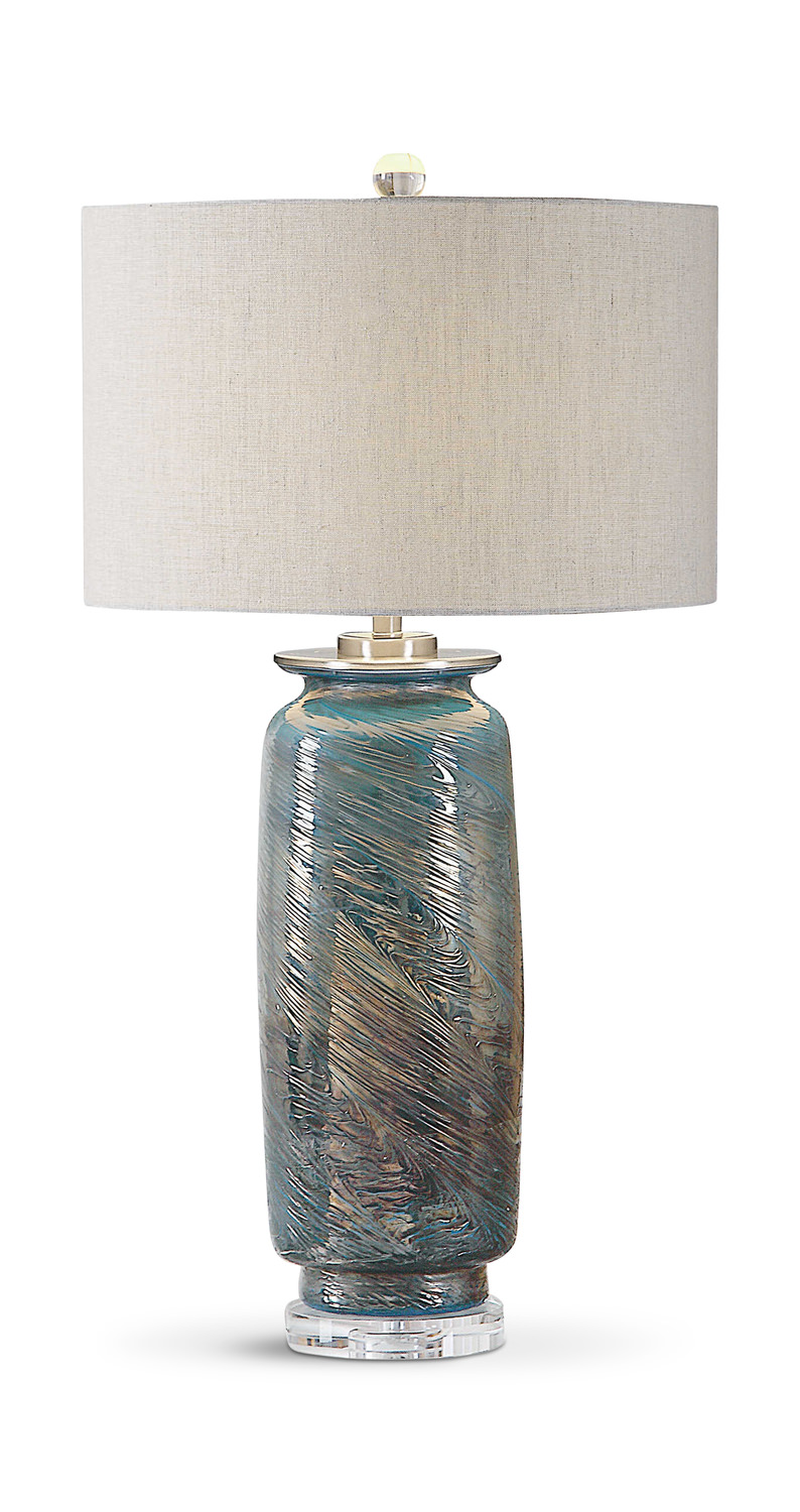 - This Table Lamp Features A Decorative Glass Base That Showcases A Unique Swirl Texture, Highlighting Shades Of Ocean Blues And Metallic Bronze. Accenting These Vibrant Colors Are Brushed Nickel Plated Details And A Thick Crystal Foot.