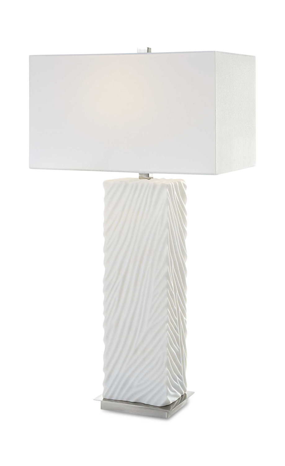 - Stylish And Sophisticated, This Table Lamp Is Executed In A Rich Carved Ivory Man-made Stone That Accurately Replicates The Look Of Thasos Marble And Is Accented By Brushed Nickel Finished Iron Details.