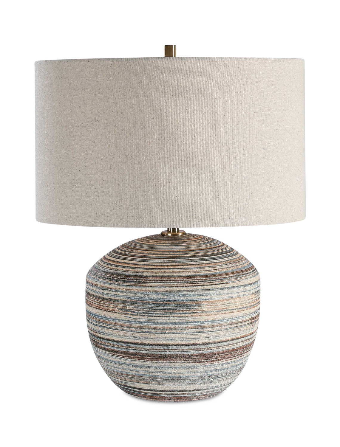 - This Ceramic Table Lamp Features A Striped Motif In Neutral Shades Of Brown, Taupe, Cream And Blue Accented By Light Brushed Brass Plated Details.