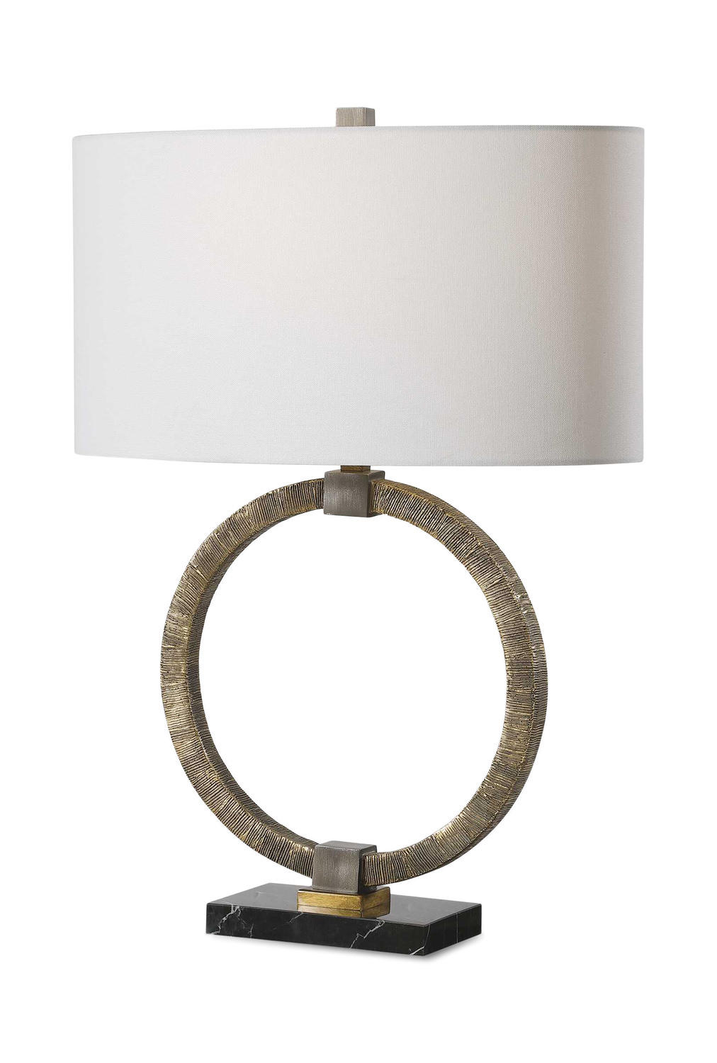 Illuminate your living space with the captivating charm of the Relic Aged Gold Table Lamp from HOM Furniture. Drawing inspiration from tribal and bohemian styles, this table lamp boasts a heavily antiqued gold finish adorned with intricate hand-carved textures and dark bronze accents, all resting elegantly on a sleek black marble foot. The lamp is paired with a luxurious oval hardback white linen shade, adding a touch of sophistication to any room. Elevate your home decor with this exquisite piece that exudes both style and character. Created by Uttermost, a name synonymous with quality and craftsmanship.