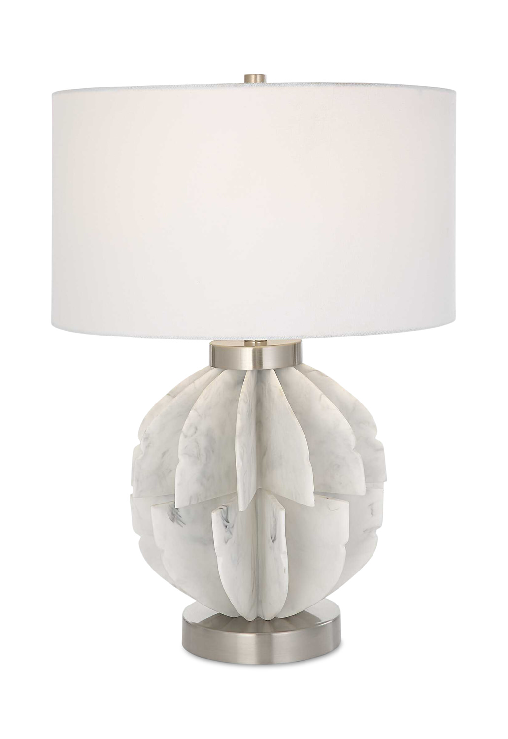 - This Contemporary Table Lamp Features Thin Stacked Blades That Create An Organic Sphere Finished In A White Marble Look Accented By Plated Brushed Nickel Accents.