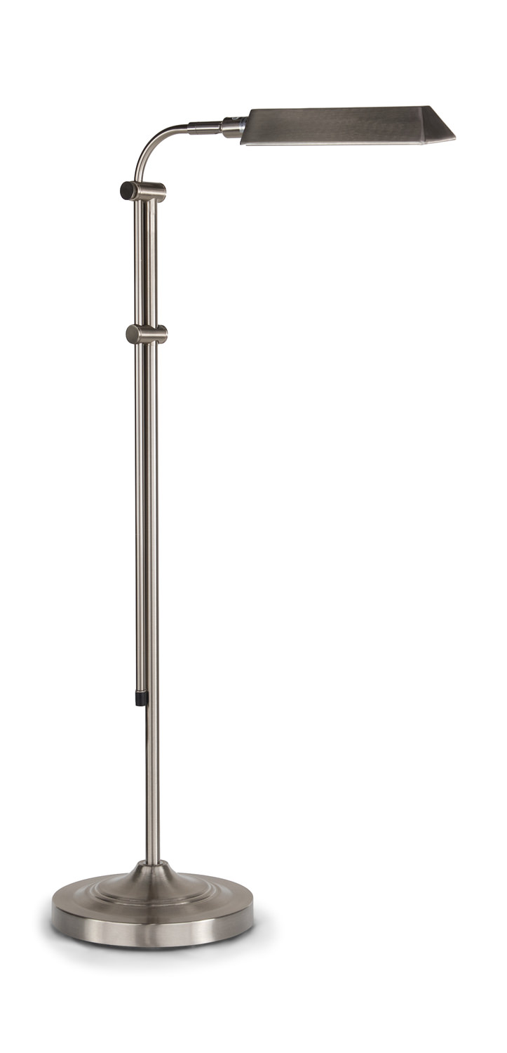 The L-shaped design of the Sheena Pharmacy, rises from a round disc base (minimal footprint) and the floor lamp's "arm" moves to accommodate and direct the light as necessary. The flat metal light shade does rotate as well, controlling the amount of light it emits. Nearly a perfect task light, this floor lamp will provide specific lighting for embroidery work, hand sewing or other similar duties.