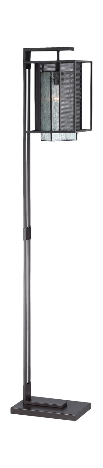 Long, lineal with dark glass panels, the Silveny Art Glass Floor Lamp is black, extending from a rectangular black metal base. The glass and metal shade, is multi-layered with a perforated screen, which shadows the inner glass. watermark, shade. Geometric emphasis is evident and attractively enhances this otherwise uncomplicated floor lamp.