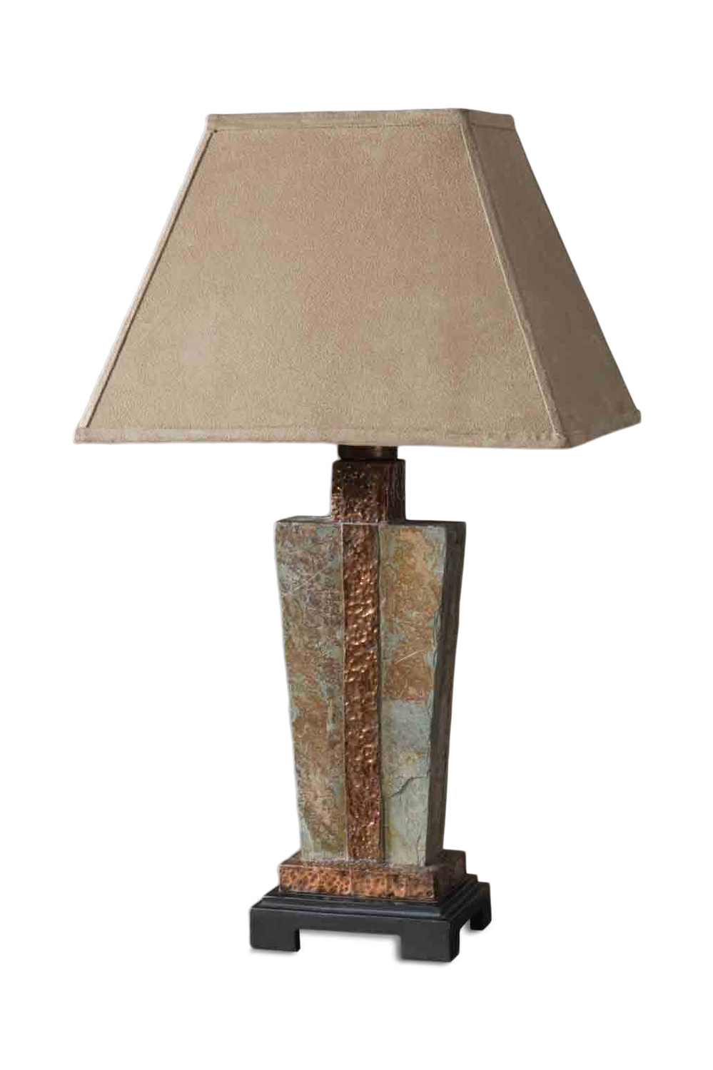 Elevate your living space with the exquisite Slate Accent Lamp from HOM Furniture. Crafted with precision from real hand-carved slate and adorned with hammered copper details, this lamp exudes a timeless elegance that will surely impress. The rectangle bell shade in brushed suede fabric adds a touch of sophistication, while its weather-resistant properties make it suitable for both indoor and outdoor use. As each piece is uniquely crafted from natural materials, expect a one-of-a-kind masterpiece for your home. The Uttermost brand ensures top-notch quality and style. Illuminate your surroundings in style with this grey Slate Accent Lamp that effortlessly blends luxury and functionality.