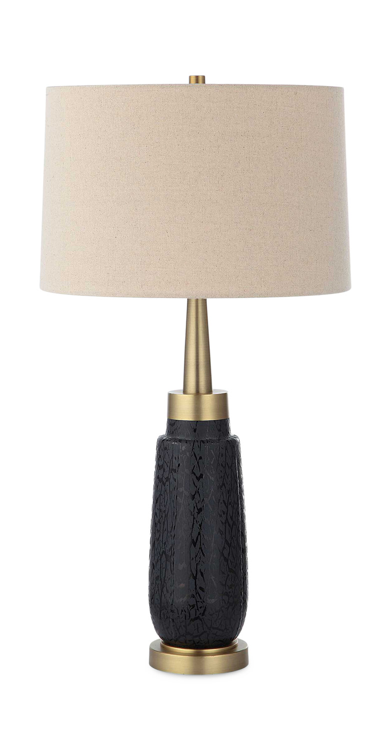 • The Spyglass Table Lamp Features A Matte Black Glass Base With Polished Black Woodgrain-like Etching, Paired With Lightly Antiqued Brass Plated Foot And Hardware.