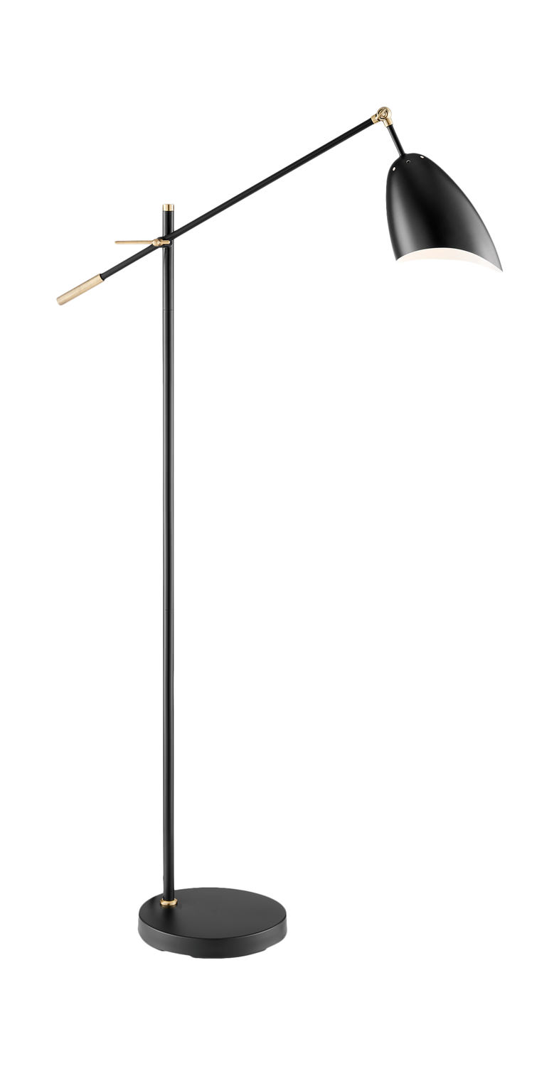A floor lamp with direction, the Tanko Floor Lamp has a black finish with antique brass accents. The stylized cone head, is able to pivot, assisting with the amount and aim, of the light benefit. A cord with in-line switch, powers this sleek lamp on/off.