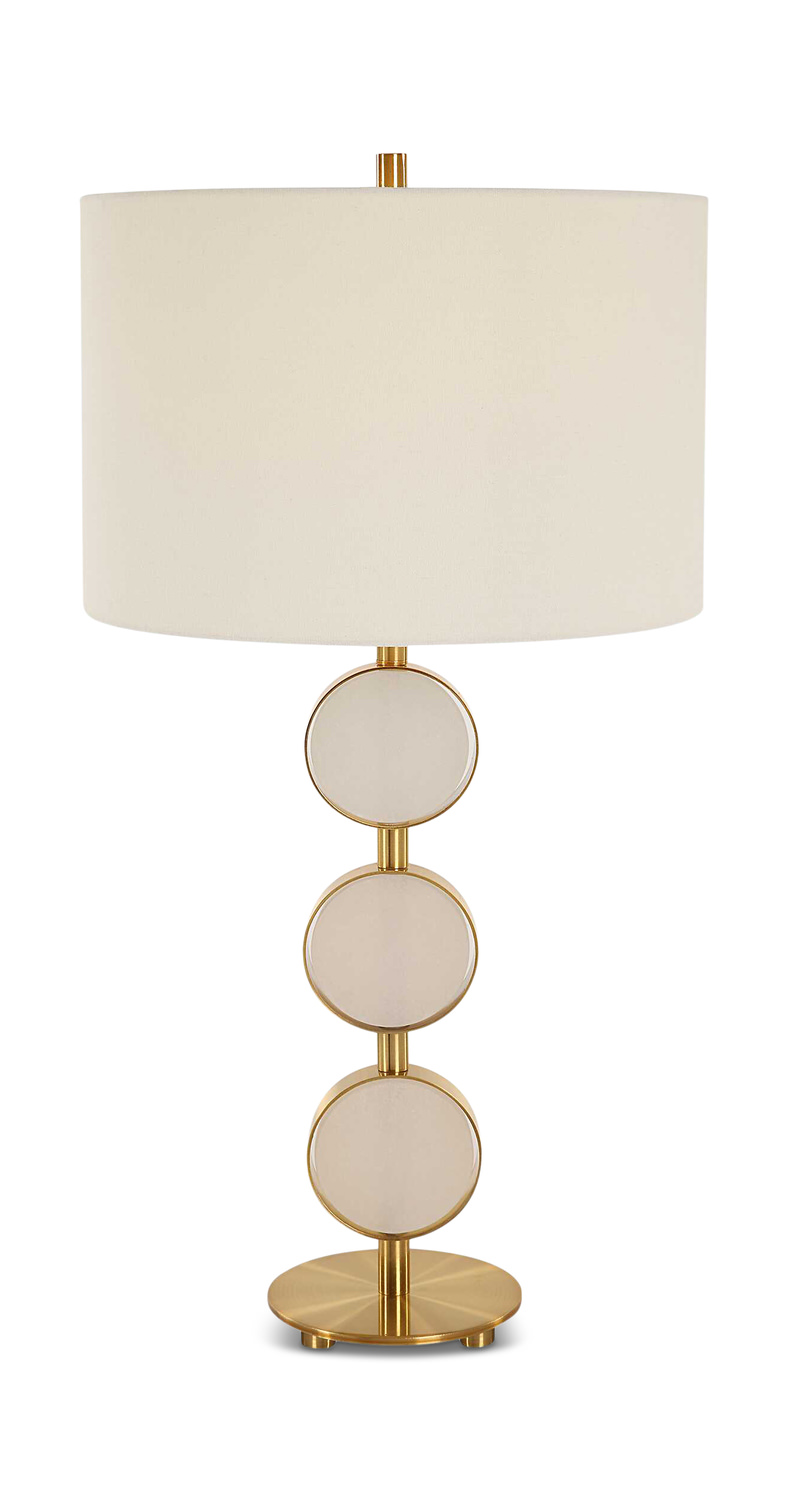 - This Table Lamp Brings A Soft Contemporary Flair To Any Room By Featuring Three Suspended Alabaster Disk Surrounded By A Sleek Metal Base Finished In A Plated Brushed Brass.