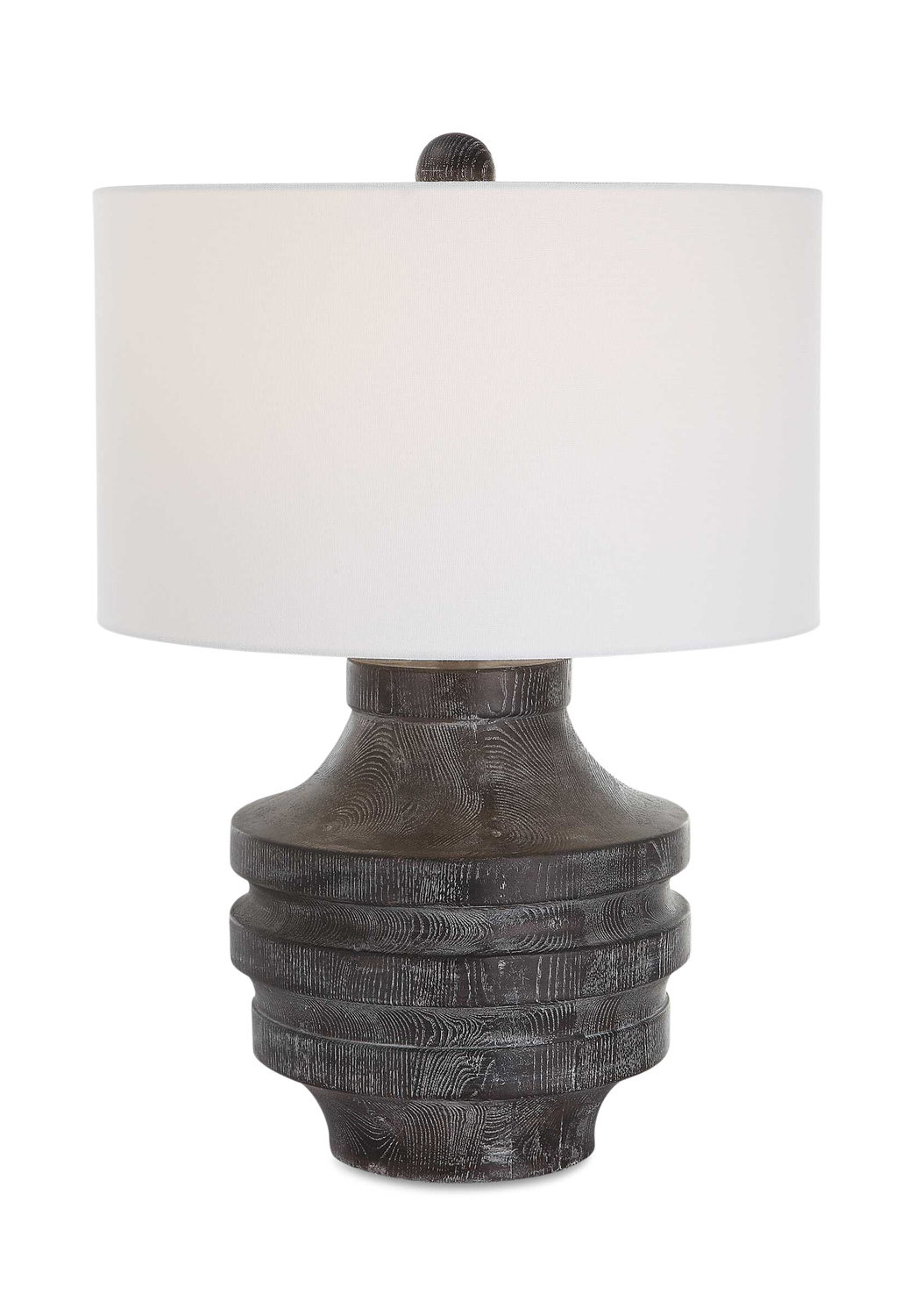 Illuminate your living space with the rustic elegance of the Timber Table Lamp from HOM Furniture. This exquisite lamp features a carved wood base finished in a transparent black stain with warm undertones and a light white glaze that beautifully enhances the faux wood grain detailing. The hardback drum shade is adorned with a crisp white cotton fabric, adding a touch of modern sophistication to the lamp's classic design. With its timeless black color and intricate craftsmanship, the Timber Table Lamp is a stunning addition to any room. Exuding charm and character, this lamp is a true statement piece that will enhance your home decor with its Uttermost brand quality.