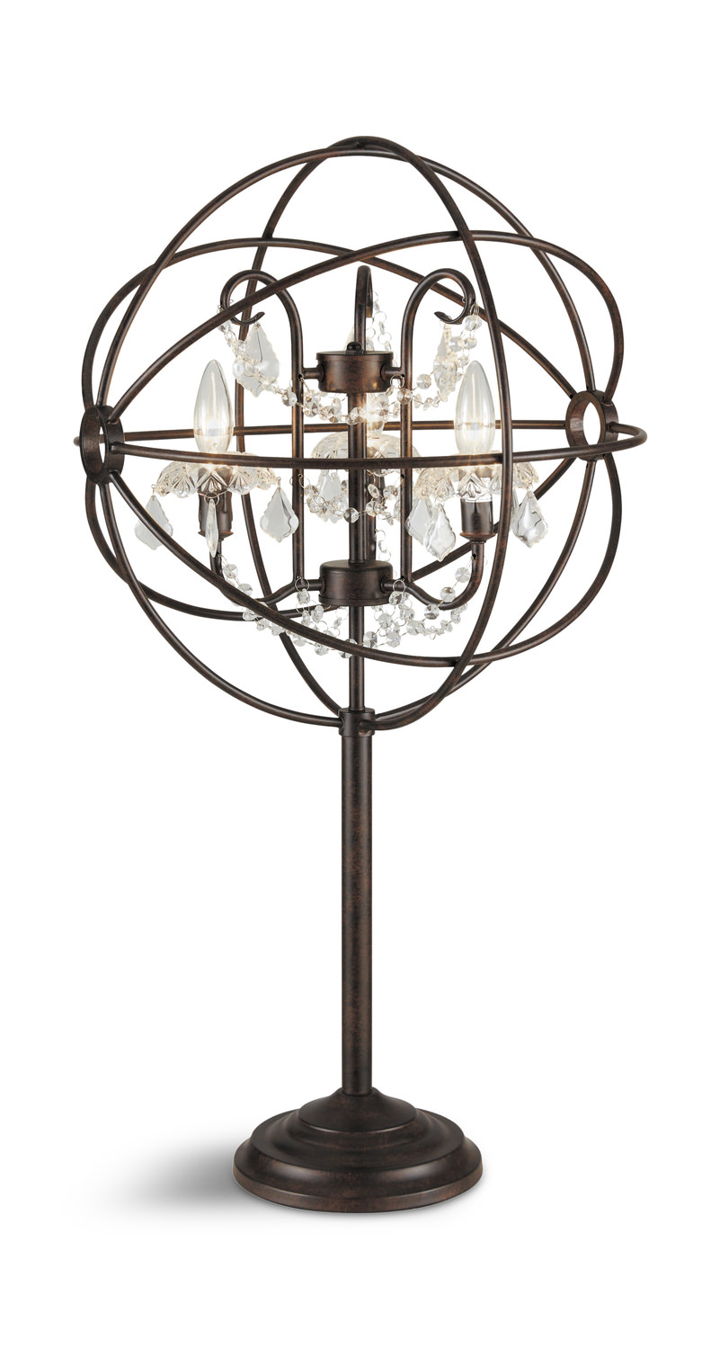 A deep, bronze finish, decorated by crystal bobeches, complete with crystal drops and delicate crystal garland, the Winona Table Lamp offers a unique lighting presentation composed inside a metal orb. This three light candelabra lamp, will light up a buffet, with its unique presentation or add a touch of bling to the room, on a sofa table. Definitely posing a look of its very own, this table lamp will surely be an eye-catcher wherever it is placed. Requires 3 E12 base 40W max candelabra bulbs.