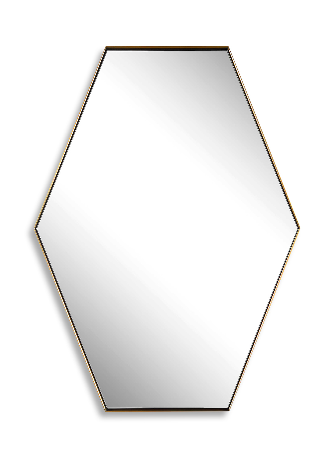 - This Hexagon Mirror Features A Contemporary Style Using A Stainless Steel Frame Finished In A Plated Brushed Brass, Surrounding A Floating Style Polished Edge Mirror. May Be Hung Horizontal Or Vertical.