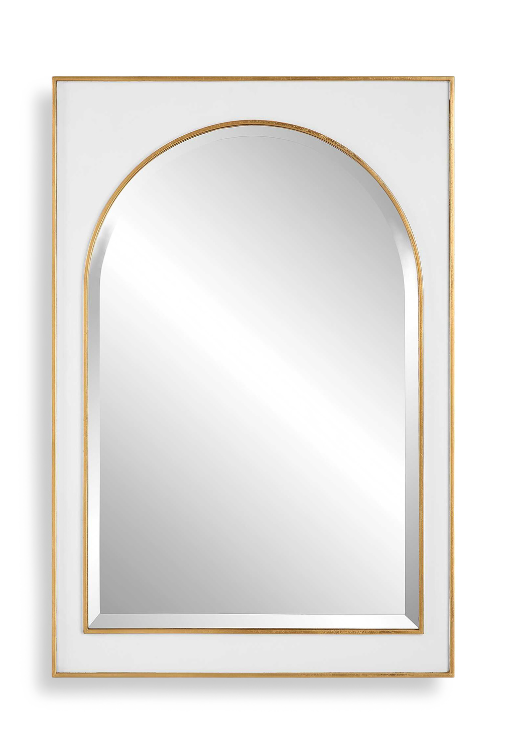 - This Iron Mirror Showcases A Gloss White Finish Surrounding The Classic Arch Shape, Accented With Raised Edges Finished In A Lightly Antiqued Gold Leaf.