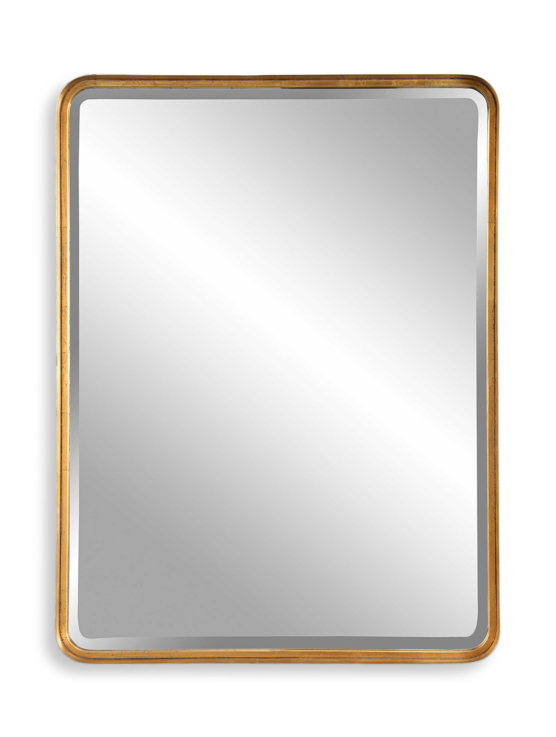- This Mirror Features A Deep Metal Band Surrounding An Offset Inner Ledge Finished In A Lightly Antiqued Gold Leaf. Mirror Has A Generous 1 1/4" Bevel And May Be Hung Horizontal Or Vertical.