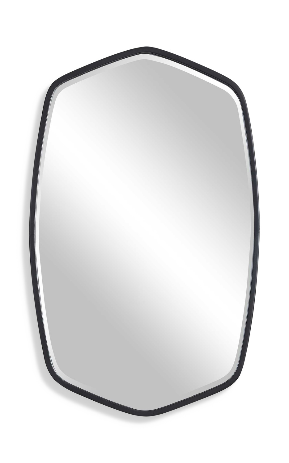 - This Hand Forged Iron Mirror Frame Features A Unique Shape With Elegant Curves, Finished In A Streamlined Satin Black. Mirror Has A Generous 1 1/4" Bevel.