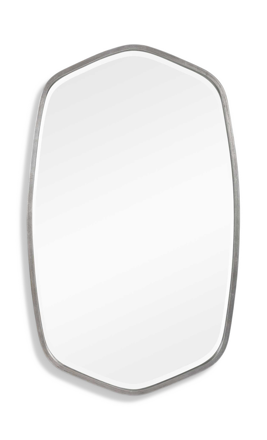 • This Hand Forged Iron Mirror Frame Features A Unique Shape With Elegant Curves, Finished In A Versatile Silver Leaf. Mirror Has A Generous 1 1/4" Bevel.