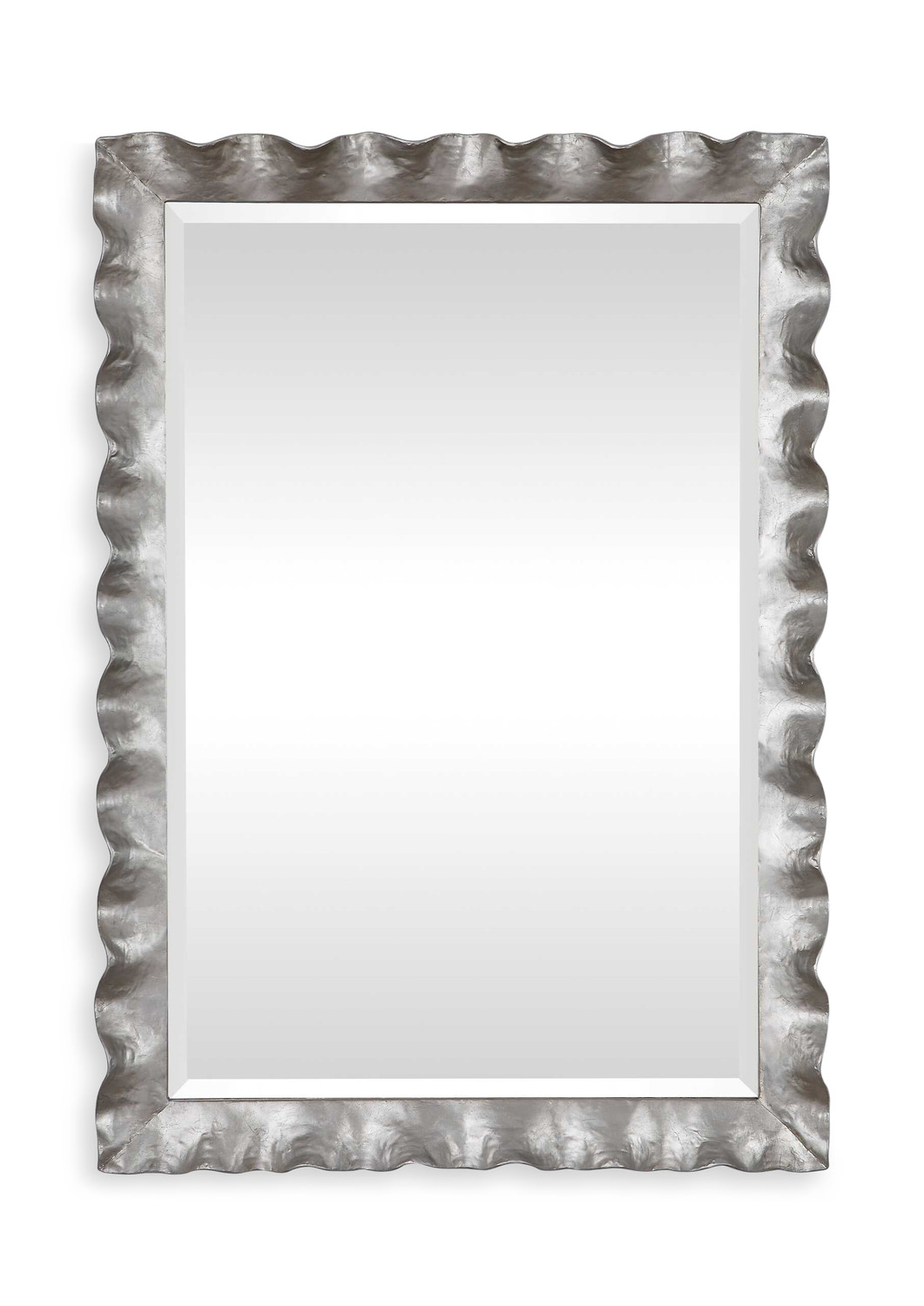 • This Mirror Features A Hand Forged Metal Frame Finished In Silver Leaf With An Organic, Scalloped Edge Design. A Generous 1" Bevel Is Added To This Piece, Which May Be Hung Horizontal Or Vertical.