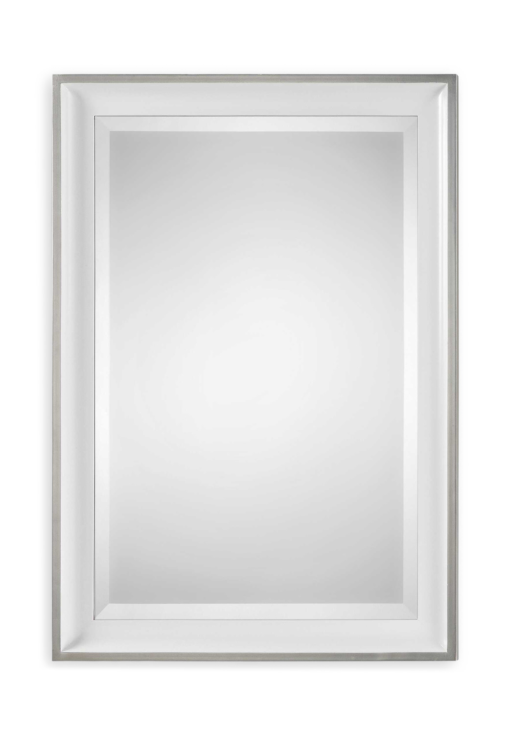 Add a touch of sophistication and elegance to your space with the Lahvahn White Silver Mirror from Uttermost. This stunning mirror features a sloped profile frame finished in gloss white, beautifully accented with a silver leaf outer edge. The mirror is expertly beveled and can be hung either horizontally or vertically, allowing you to customize it to suit your space perfectly. The silver color adds a touch of glamour and luxury to any room, making it a standout piece in your home decor. Elevate your style with the Lahvahn White Silver Mirror from Uttermost and create a chic and polished look in any room.