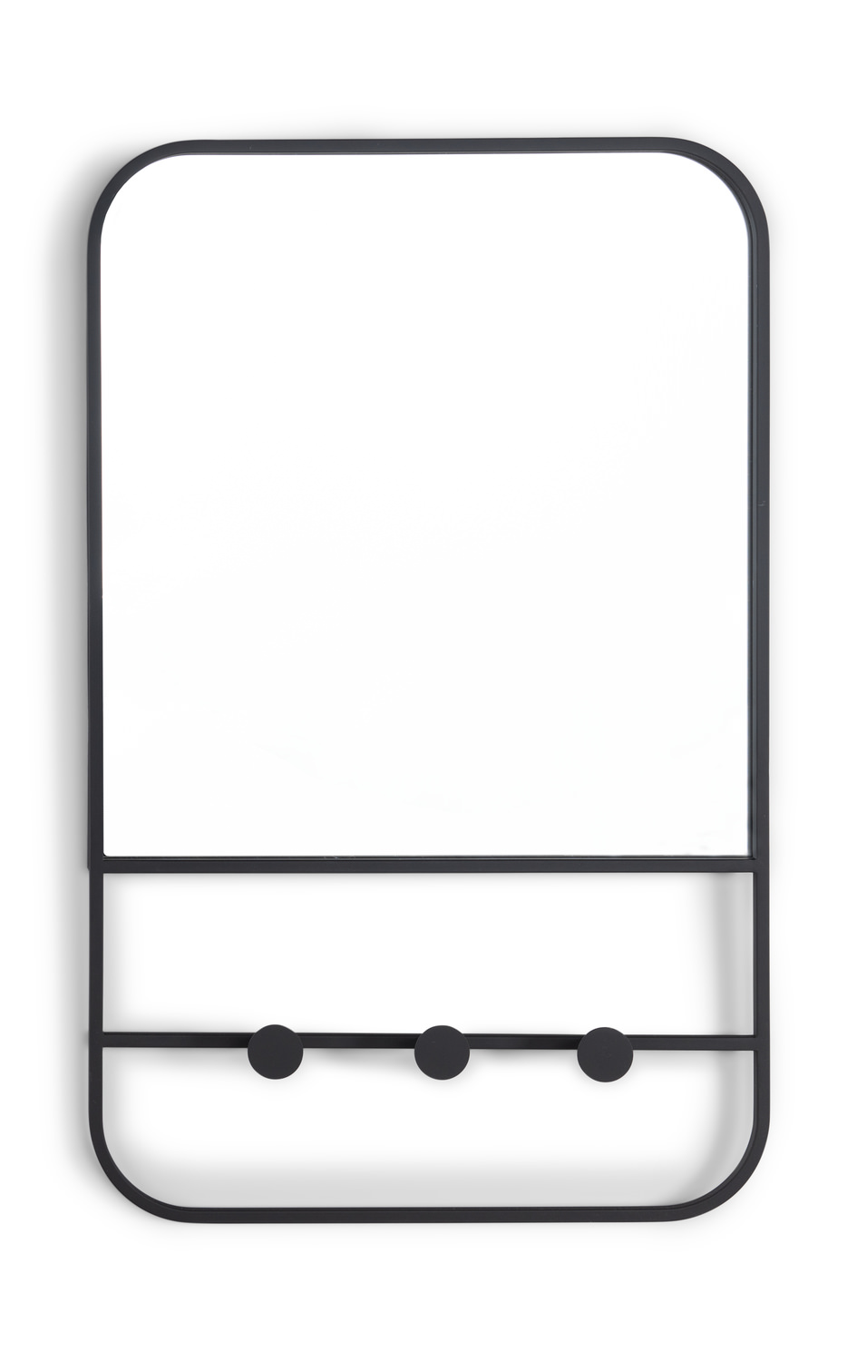 The Mod Metal Mirror offers metal construction with an open base and actual knobs, upon which items may be hung. A black finish decorates the metal of this rounded corner rectangle, with mirrored glass. Whether you place it in a bathroom or an entry, there are many accommodations this mirror brings to your interior, so you can fix your hat, or hang your tie, with this multi-purpose mirror.